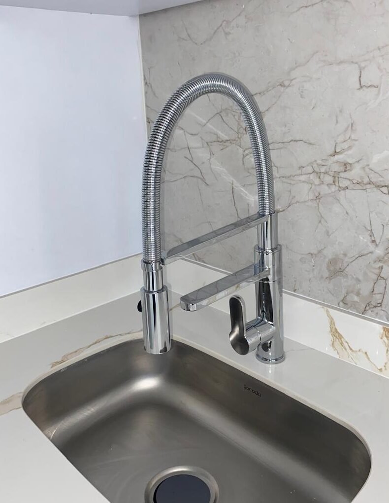 Elegancia y funcionalidad para tu cocina. Diseño moderno, grifería flexible para mayor alcance y control preciso del agua. ¡Complementa tu cocina integral con estilo!.