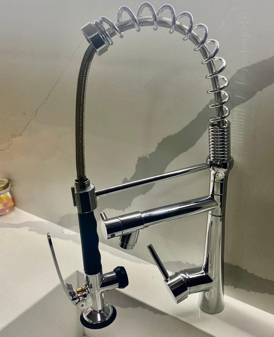 ¡Transforma tu cocina con nuestra grifería de diseño moderno! Su mango flexible con muelle te ofrece un alcance excepcional, facilitando la limpieza de ollas y sartenes grandes. Su elegante acabado cromado añade un toque de sofisticación a tu cocina. Durabilidad, estilo y funcionalidad en un solo producto.