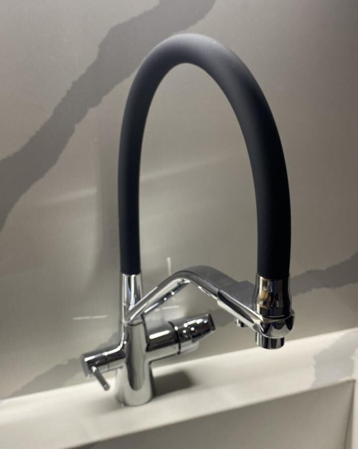 Diseño moderno y sofisticado con mando flexible para control preciso del agua en goma negra para mayor comodidad y alcance.