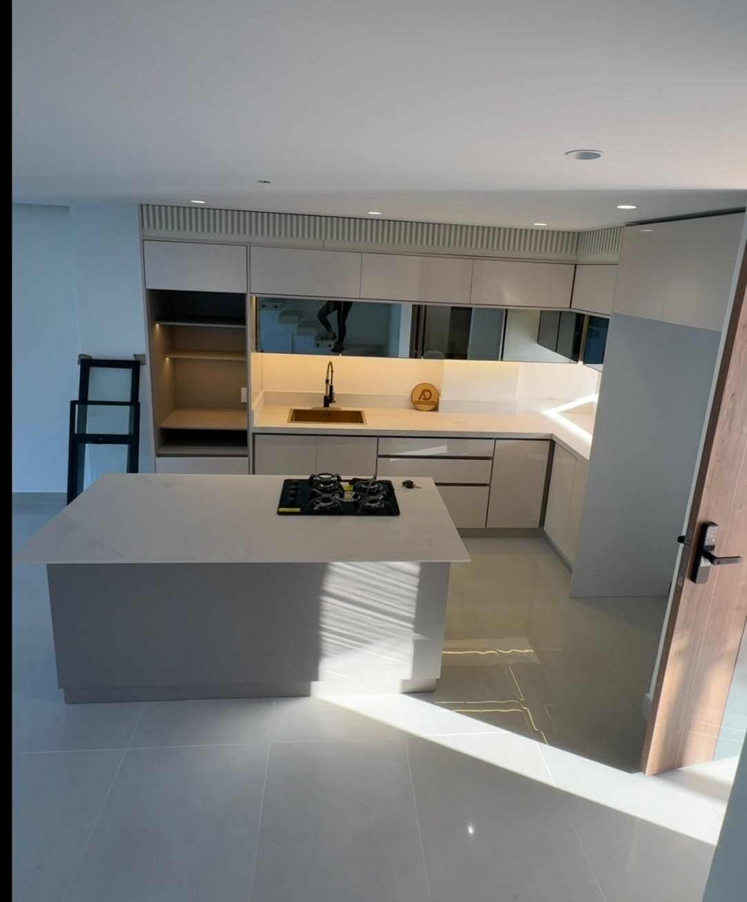 Cocina integral elaborada en RH (Material resistente a la humedad) de 15 mm con parte inferior, torre y nicho en mate; Lamina en alto brillo en la parte superior junto con luz dilatada en su inferior; Mesón e isla en Quarzon color calacatta.