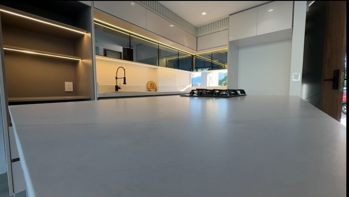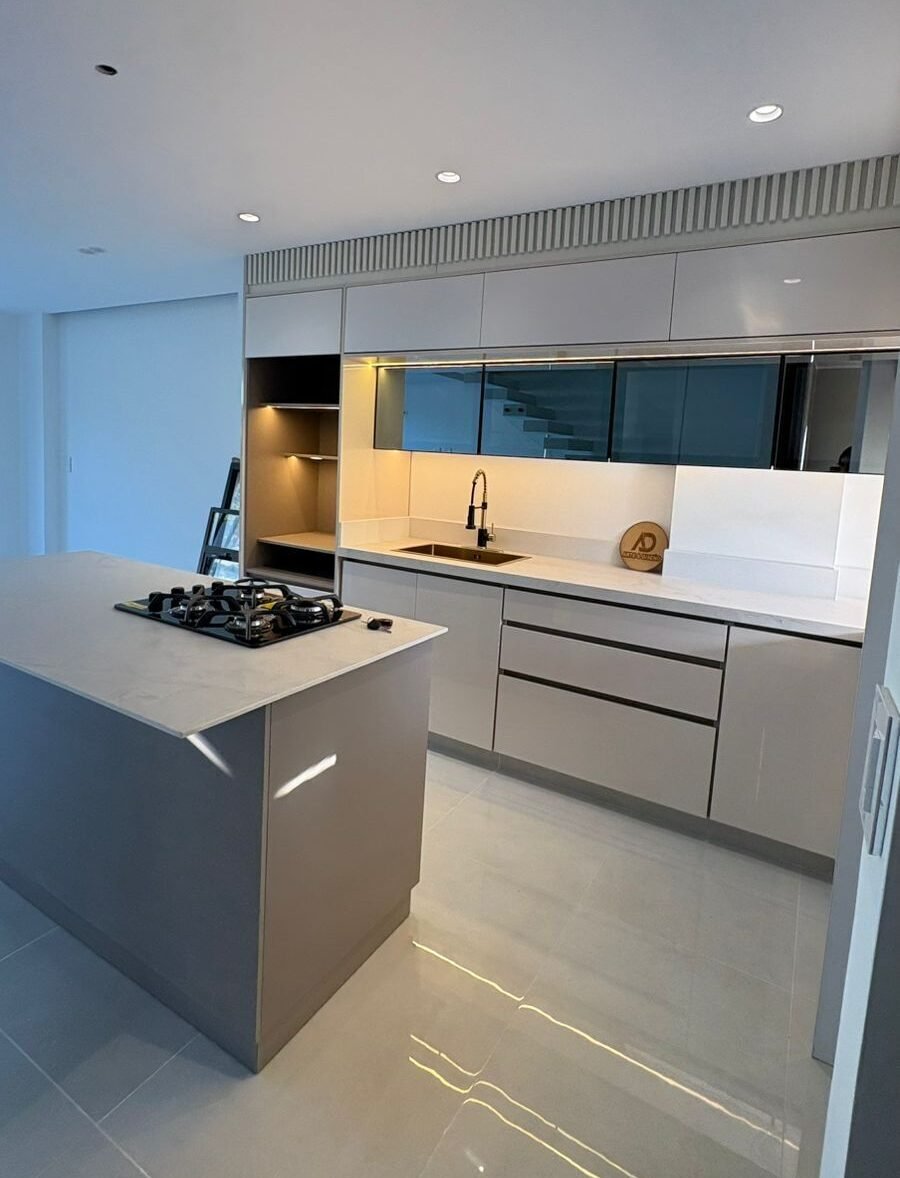 Esta es una cocina en RH (Material resistente a la humedad) de 15 milímetros con estructura inferior en color mate plomo, parte superior con frentes en poliuretano, luz dilatada blanca debajo del mueble principal, mesones en color bianco calacatta sinterizado y finalmente, Isla para estufa con pata en cascada tambien en color bianco calacatta.